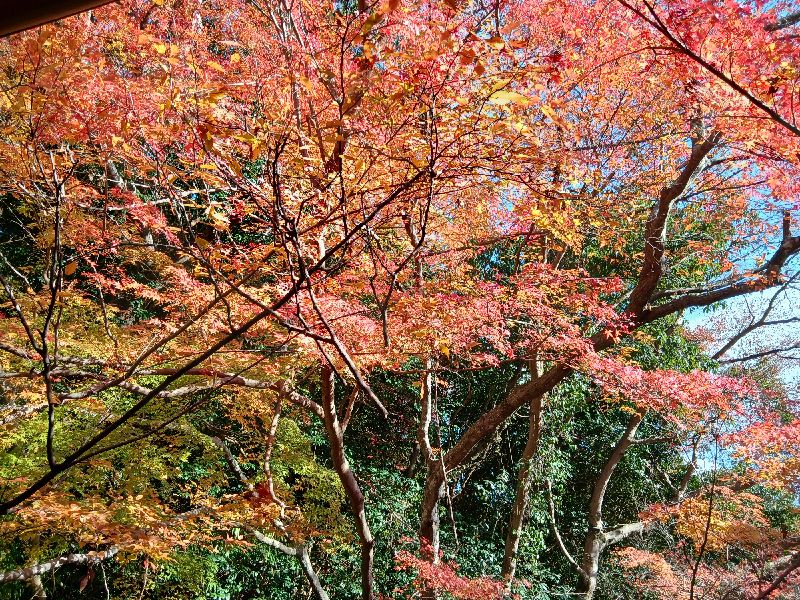 伊豆の自生林は比較的温暖な気候のため、北関東のような大きな寒暖差によって赤く染まる樹木の種類は少なめ。真っ赤になる木々よりオレンジや黄緑が多いため、自然のままだとこのような光景です。つまり寒い地方以外で人里に真っ赤な紅葉があるのは人が手を入れているからですね。京都の紅葉などはその典型です。